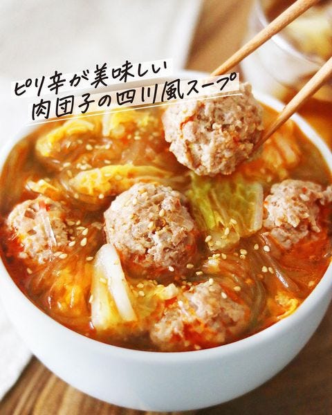 こちらは肉団子を使ったピリ辛のスープです。おこわの献立には、ピリッと辛い刺激的な汁物を合わせるのもおすすめ。