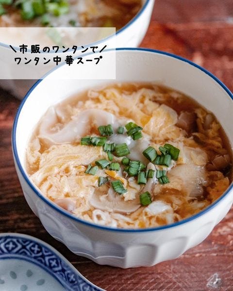 こちらは市販のワンタンを使った卵スープです。肉ワンタンを具材にすると、汁物のボリュームがアップして食べ応えのある献立になりますよ。