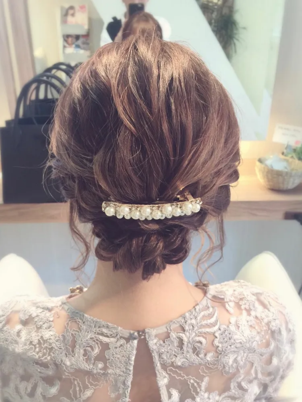 あとは左に寄せた位置で再度くるりんぱしてから毛先を巻き付けてピンでとめ、ヘアアクセサリーをプラスしてあげればできあがり。