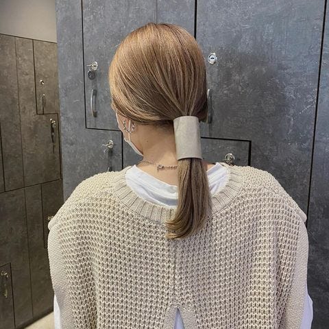 便利なヘアアクセサリーを使うと、ミディアム〜セミロングな長さのローポニーテールもかっこいい雰囲気の髪型に仕上がります。