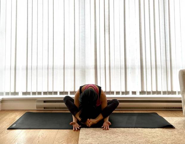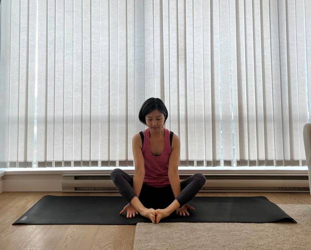 (1)あぐらをかいて座り、両方の足の裏を合わせる。膝を上下に揺らして股関節を緩める。手のひらで膝を下に押して、さらに股関節を緩める。