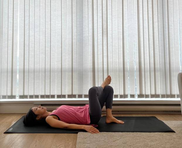 (1)膝を立てて仰向けに寝る。お尻や腰がマットから浮かないように。