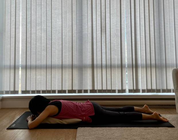 (5)深い呼吸を繰り返しながら上体の力を抜いていき、首の力も抜いてゆっくり呼吸を繰り返す。30秒〜1分ホールドする。