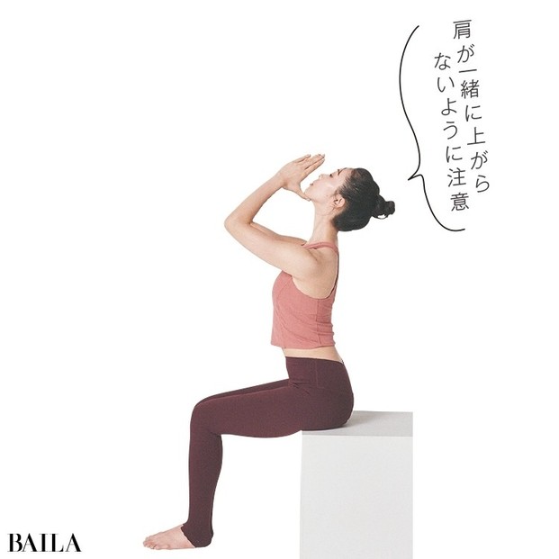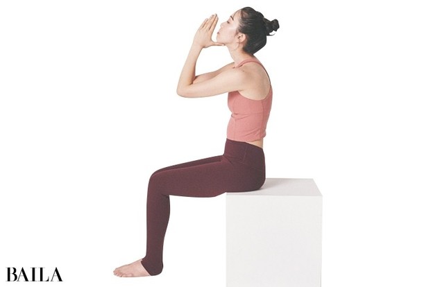 鼻から吸う息で、顔と手を上げて、鼻先で天井を見るイメージ。あごの下の手は添えるだけで、力を加えないことがポイント