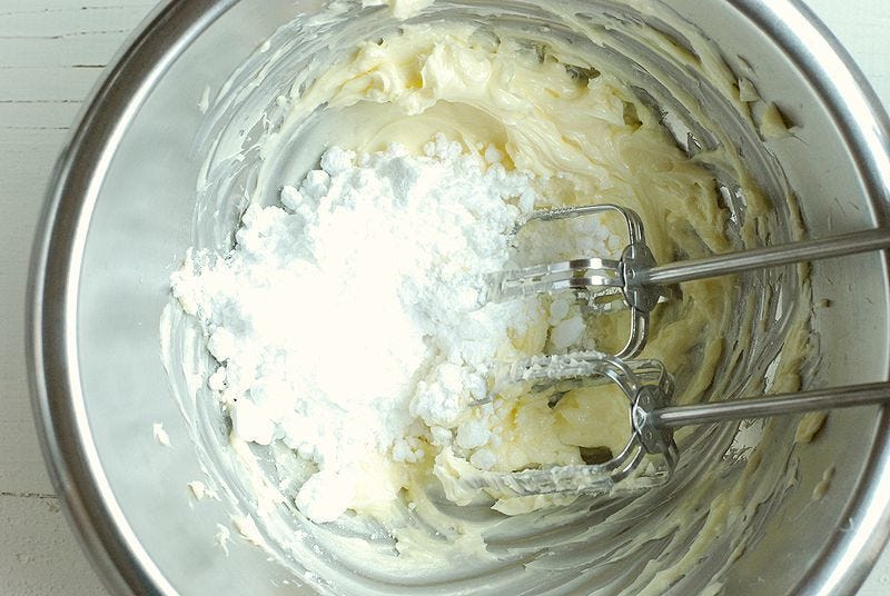 ① ボウルに無塩バターと粉糖を入れ泡立て器でふんわりするまでよく混ぜ合わせる。