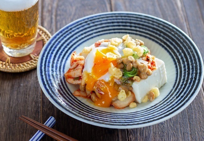 おつまみの定番豆腐に、キムチ、納豆、温泉卵を組み合わせたボリュームたっぷりの冷奴。盛り付けるだけですが、キムチの辛さと納豆の風味、温泉卵のまろやかさがよいハーモニー。高たんぱく低カロリーなのもうれしいおつまみです。
