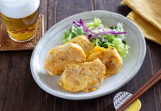 サラダチキンをスライスし、鰹節を混ぜた卵液で包んで焼き、和風に仕上げたピカタです。サラダチキンなので、火の通りを気にせずに作れるのがうれしいところ。おつまみだけでなく、お弁当の一品にもぴったりですよ。