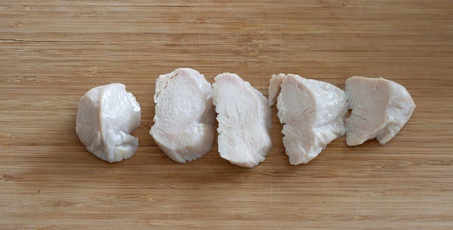① サラダチキンは、1.5cm位の斜め切りにする。