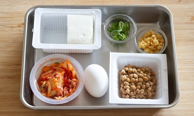 ① 納豆は添付のたれとからしを加えて混ぜる。キムチは大きければ食べやすい大きさに切る。