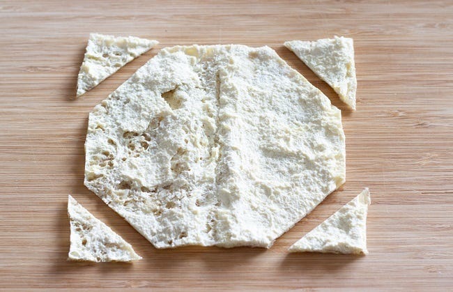 ① 油揚げは、キッチンペーパーでおさえて油分をとり、長い辺を残して3辺を少しだけ切り落として開く。器に合わせて四隅を切る。