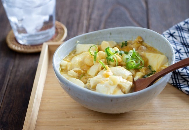 豆腐に天かすを組み合わせるだけでも、手軽なおつまみになりますが、少し材料をプラスして、卵を組み合わせて卵とじ風にレンジ加熱しました。少し濃いめの味付けにすれば、ご飯のおかずにもなります。