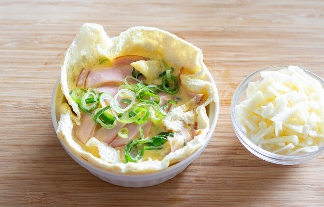 ② ハムは横半分に切り、縦に1cm幅に切る。卵を溶き、マヨネーズ、青ねぎ、ハム、塩、こしょうを加える。
