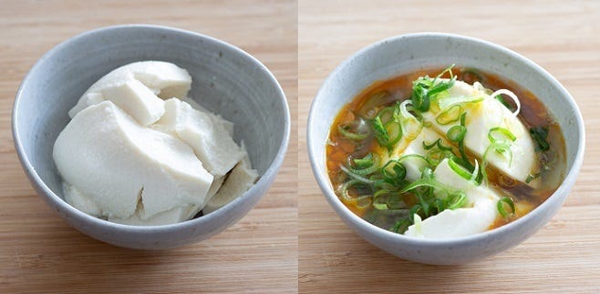 ① 豆腐をすくって器に入れ、麺つゆを加え、ラップをふんわりかけて電子レンジ(600W)で1分加熱する。