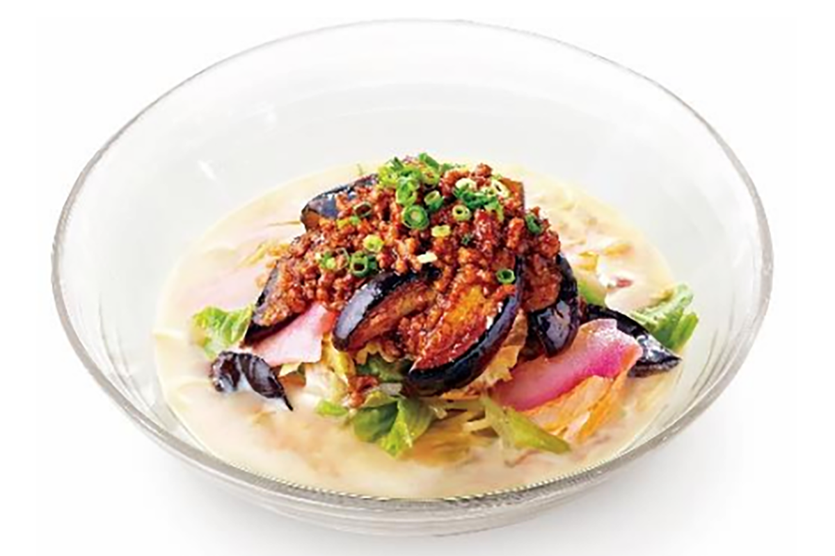 『冷やし麻婆茄子ちゃんぽん』の7種類の国産野菜は、旬の茄子などを存分に使用。麻婆茄子は、新鮮な茄子を店舗で丁寧にカットし、こんがり 焼いてから、味噌だれで深みを出した自家製麻婆ソースを絡め、冷たくしてから提供している。