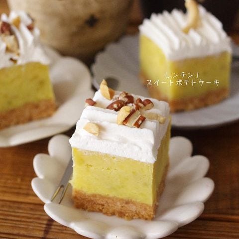 しっとり生地が美味しいスイートポテト味のミニケーキです。ミニサイズで切り口を見せることで、色の層が見えておしゃれに仕上がりますよ。