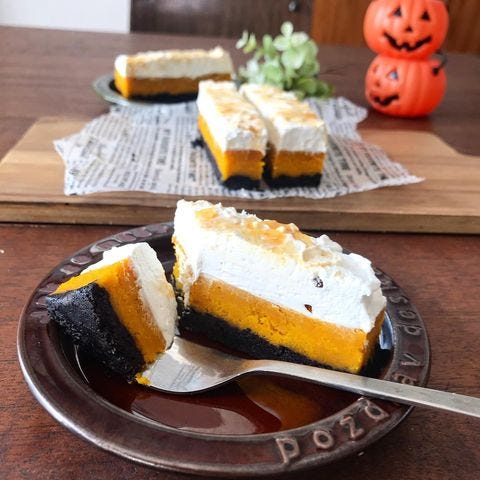 底に敷いた黒いビスケットと、オレンジのかぼちゃ、ホイップの白の彩りがとてもおしゃれで豪華に見えますよね。