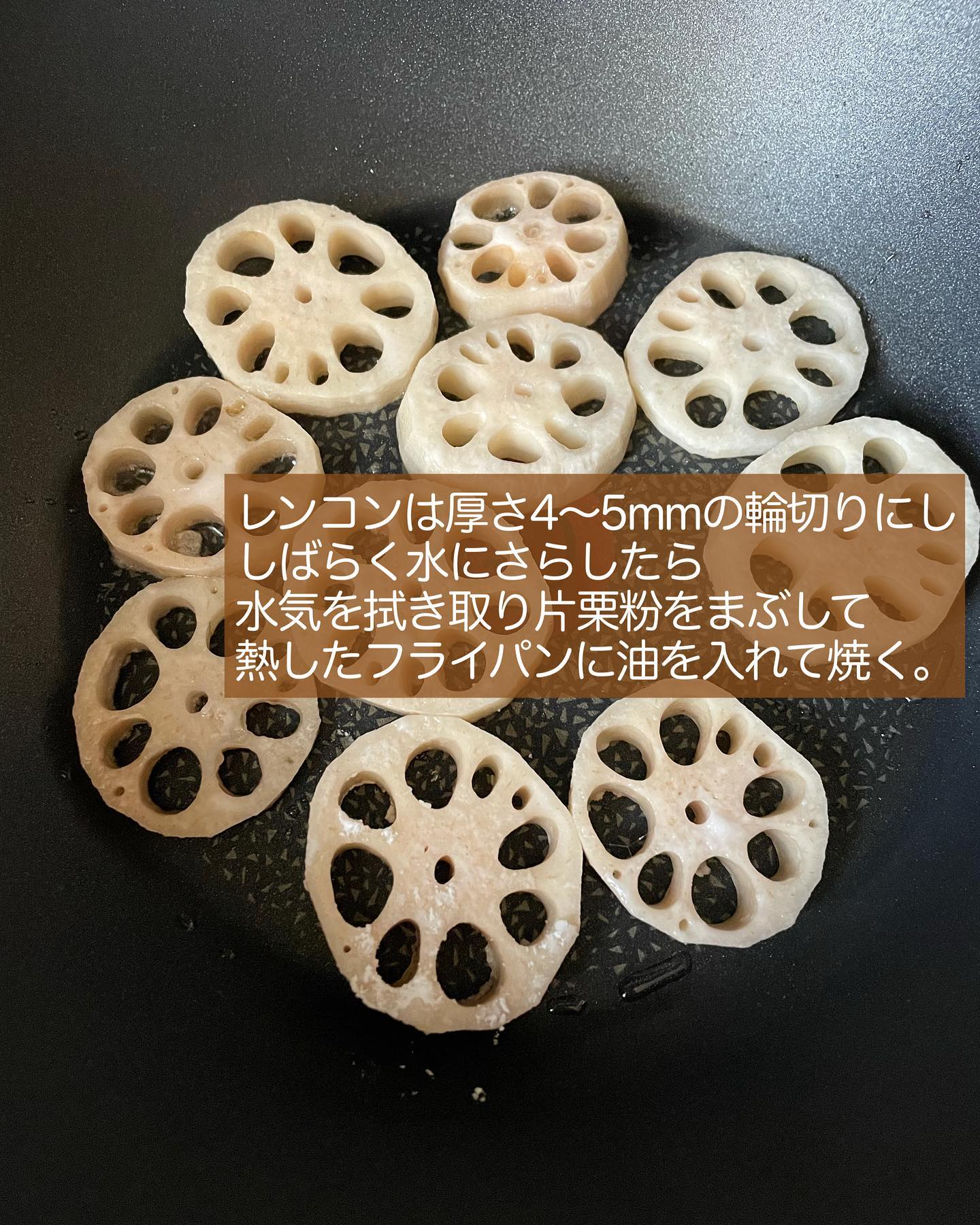 レンコンは暑さ4〜5mmの輪切りにししばらく水にさらしたら、水気を拭き取り片栗粉をまぶして熱したフライパンに油を入れて焼く。