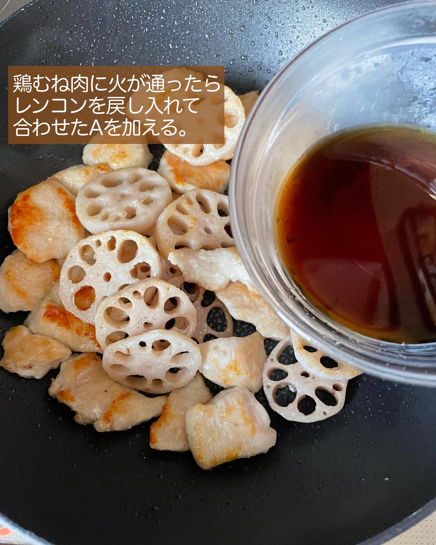 鶏むね肉に火が通ったらレンコンを戻し入れて合わせたAを加える。