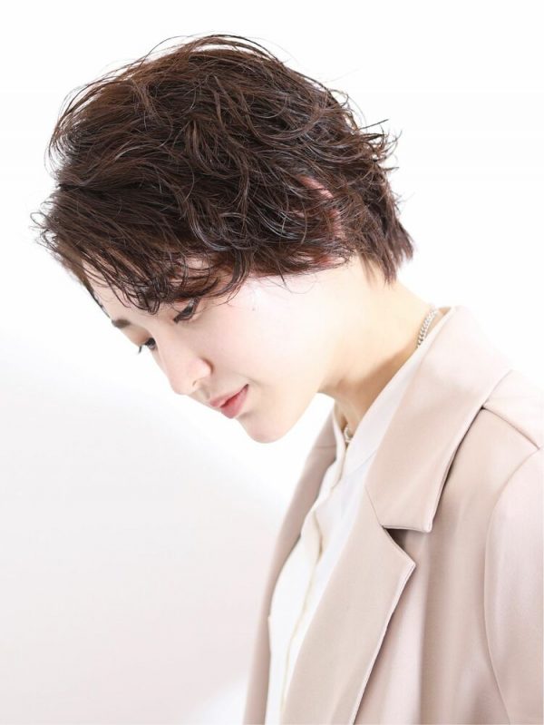 ショートレイヤーはクールなイメージがありますが、ゆるふわパーマをかけると女性らしく柔らかい印象にできますよ。