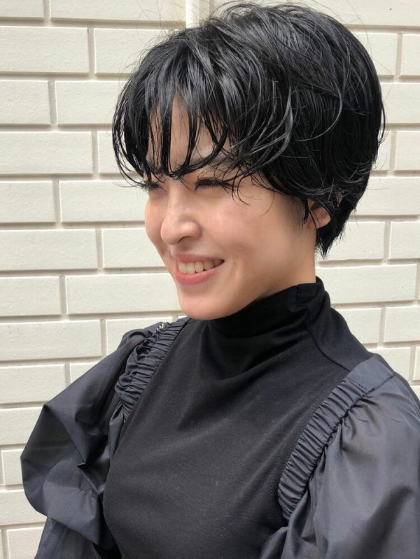 ハンサムショートのショートレイヤーですが、長さのある髪の柔らかい動きが女性らしさを演出していますね。