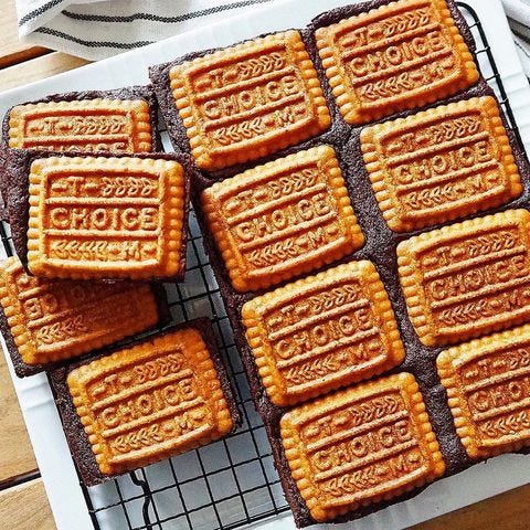 ブラウニーの表面にチョイスクッキーをのせて焼くおしゃれな手作りレシピです。