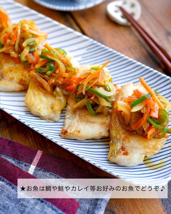 片栗粉をまぶしたお魚をこんがり揚げ焼きにして、お野菜入りの南蛮だれをたっぷり乗せていただきます!