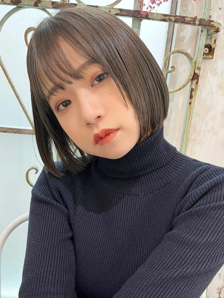子供っぽく見られがちなボブスタイルは、暗めのアッシュ系ヘアカラーで落ち着いた雰囲気に仕上げ、品よく見せるのが大人女性におすすめです。