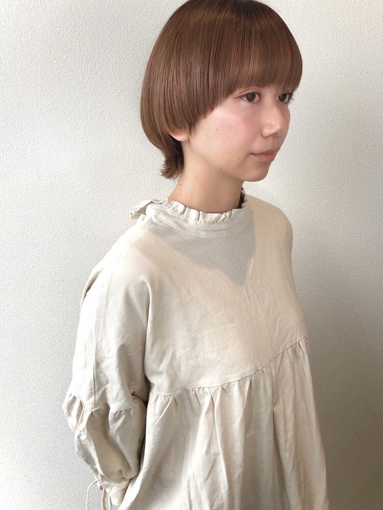 丸みのあるシルエットでも可愛くなりすぎないマッシュショートの髪型なら、ハイトーンのベージュで明るめに仕上げても幼く見えません。
