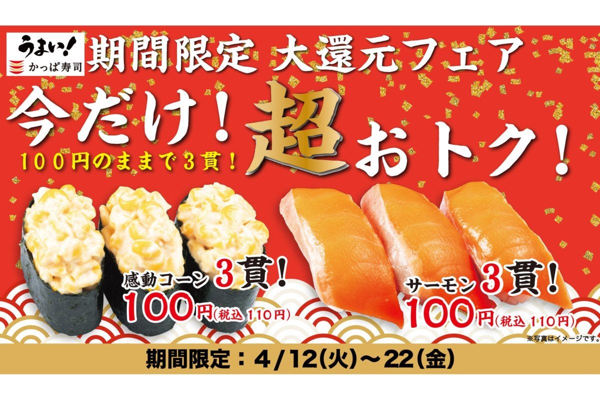 回転寿司チェーンの「かっぱ寿司」が、12日〜22日の期間限定で『感動コーン』『サーモン』を通常の2貫から3貫に増量するお得なキャンペーンを開催する。