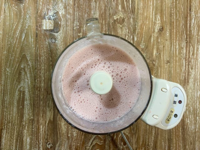② いちごときび糖をフードプロセッサーに入れて滑らかに攪拌し、ヨーグルト・①の溶かしたゼラチンを加えてさらに滑らかに攪拌します。