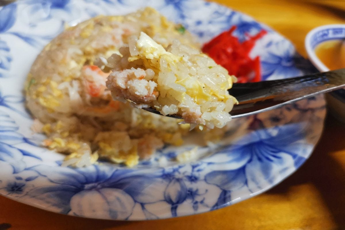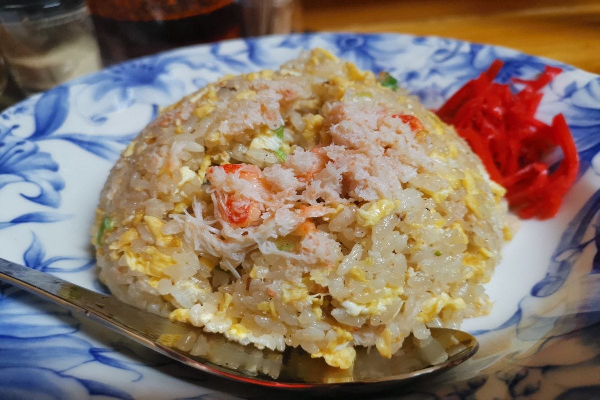 料理を作る動作にほれぼれしていると、ほどなくカニチャーハンが届く。こ、これは美しい...。飾らなくも一級品に美しいビジュアルは、10代の頃の広末涼子を思い出すほどの輝きである。