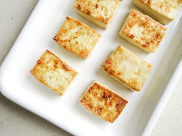 ⑤ ③のフライパンをよく熱し、④の豆腐を入れ、中弱火で底面に香ばしい焼き目がつくまでゆっくり焼きます。裏面も同様に焼きます。