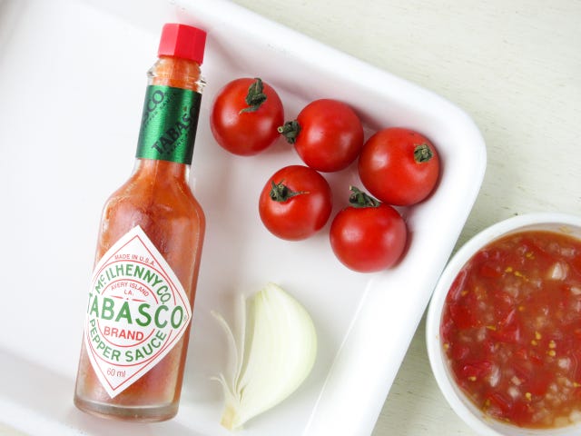 ② ミニトマト、玉ねぎをあわせ、タバスコ、塩で味を整えます。