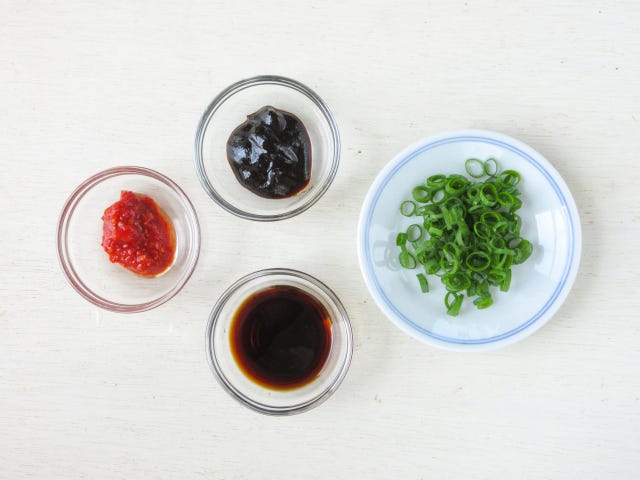 ② 豆腐ステーキを取り出したフライパンに豆板醤を入れ、弱火で炒めます。いい香りがしてきたら甜麺醤、醤油を加えてよく混ぜます。タレのできあがり。