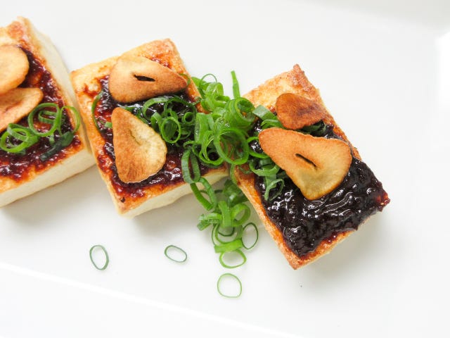 ③ 器に豆腐ステーキを盛り付け、②のソースをかけ、ガーリックチップを散らします。出来上がり。
