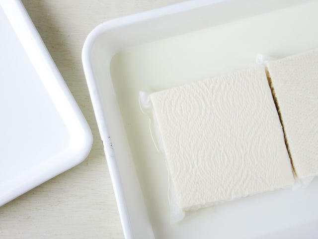 ① 豆腐はキッチンペーパーで包み、バットなどで重しをして水切りしておきます。