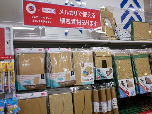 ダイソーで売れているメルカリ用の梱包材です。あまりの人気から、今回ついにコラボ商品を開発したのだそう。発送に必要なアイテムに加え、店内にはメルカリポストまで設置されているんですよ。