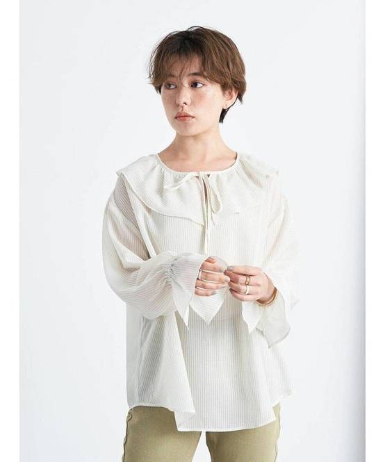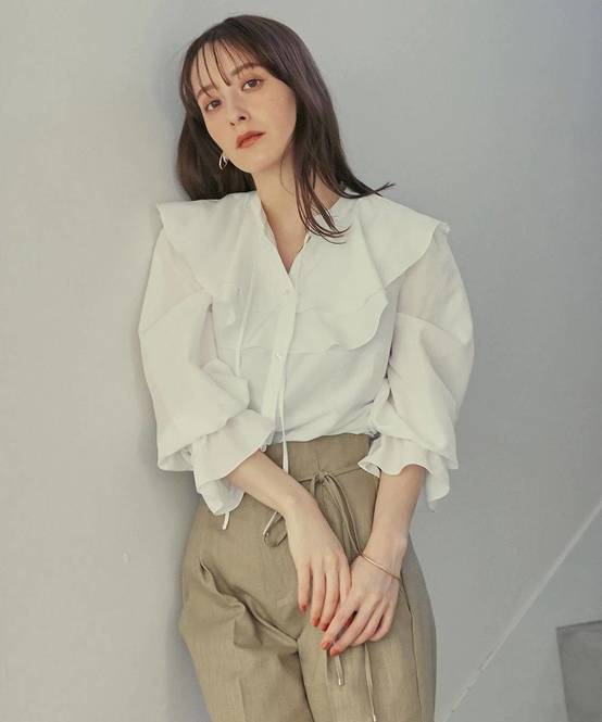 春に買い足したい白ブラウス③Ferouxのワッシャーエステルラッフルボリュームカラーブラウス
