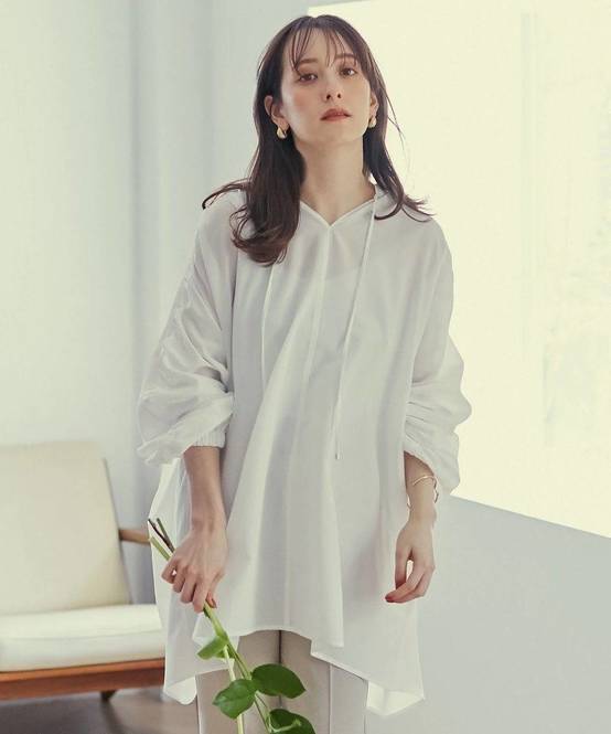 春に買い足したい白ブラウス②Ferouxのワッシャーエステルボリュームチュニックブラウス