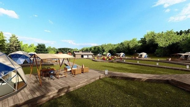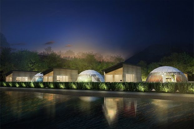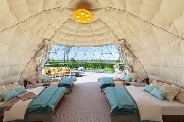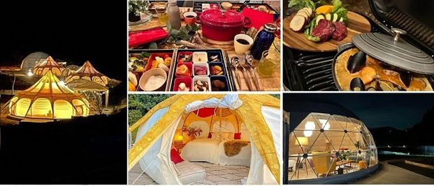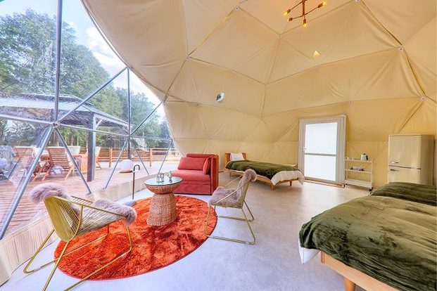 広大なグランピングエリアには、ユニークなタマネギ型のテント、贅沢なジャグジー付きのドーム型テントなど、大小さまざまな17棟のテントがゆったりと配置されています。