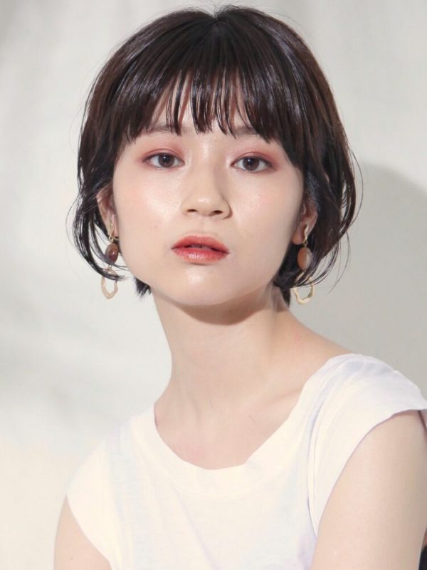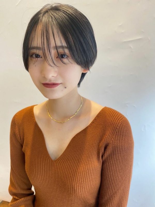 面長さんは縦長の輪郭が特徴のため、その部分をカバーするために前髪ありの黒髪ショートがおすすめです。