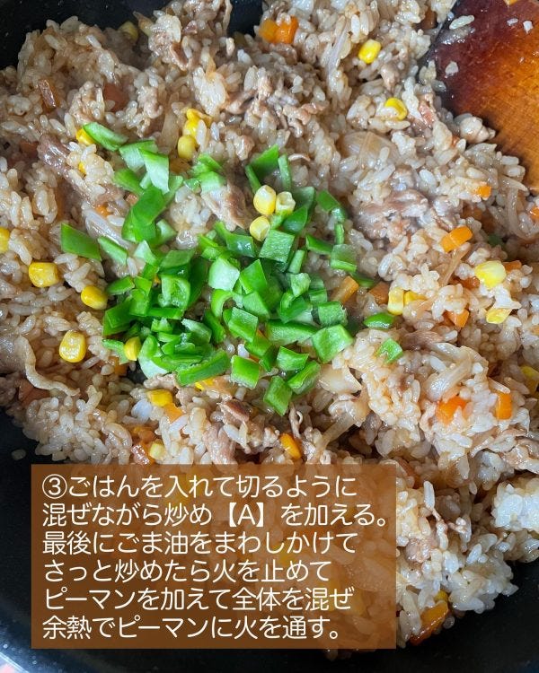 作り方③ごはんを入れて調味料を加える