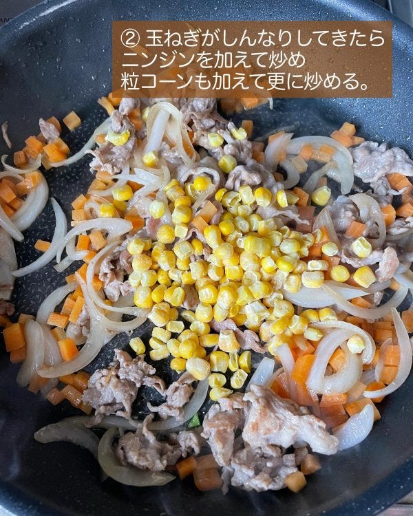 作り方②ニンジンとコーンを加える