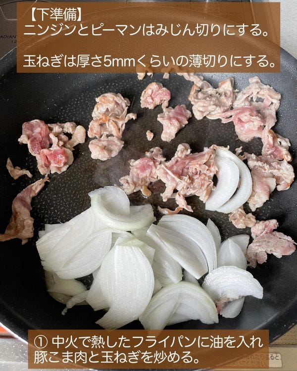 作り方①豚こまと玉ねぎを炒める