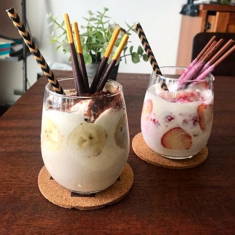 ただ混ぜるだけでできるこちらのフローズンポッキーシェイクは、バナナやいちごを器に入れ、バニラアイスと牛乳を入れて混ぜれば完成です。