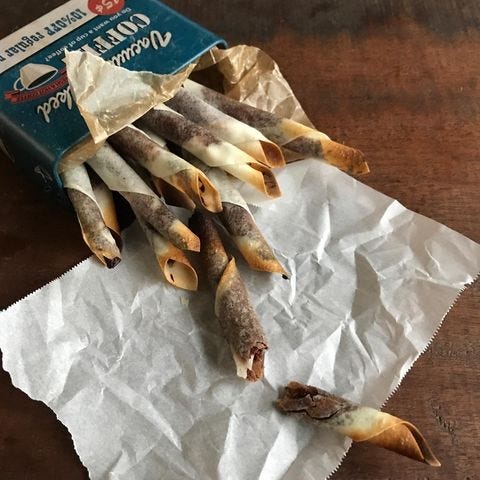 電子レンジで溶かしたチョコレートを皮に薄く塗り、くるくる丸めたあとトースターで焼くだけです。