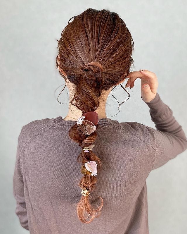結び目部分にヘアアクセサリーをつけてもアクセントになり、ほどよく華やかな仕上がりになります。