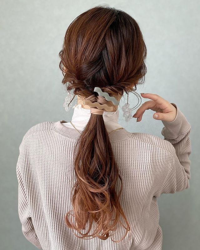 くるりんぱと三つ編みを組み合わせると、大人っぽくふんわりとした編み下ろし風ポニーテールを作ることもできます。