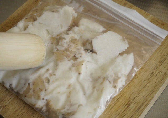 ずっと手で触れていると、手がかゆくなってしまう場合もあるかもしれません。そんなときには、すりおろすよりも、「たたく」がおすすめです。すりおろしたような粘りも出て、新しい食感が生み出されます。
