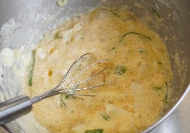 ② ボウルに①とチーズ以外の材料を入れ、泡立て器で空気を含ませるようによく混ぜる。